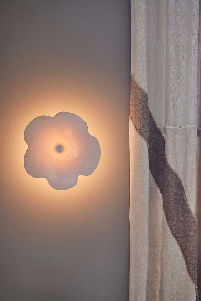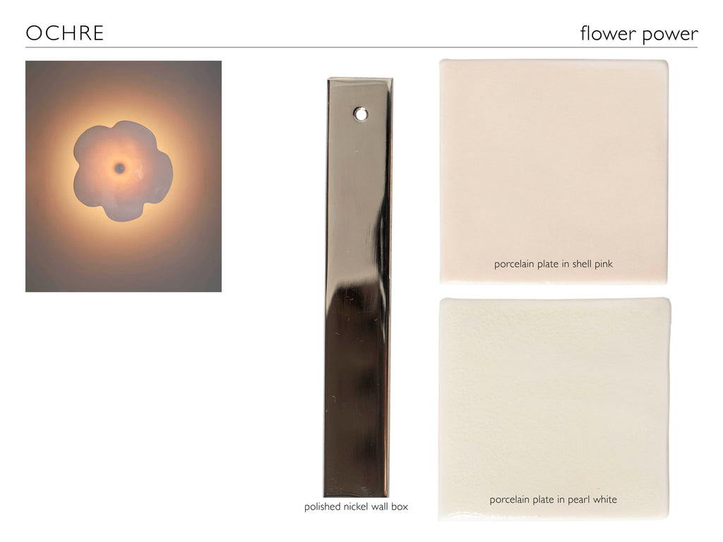 floral porcelain shade in shell or pearl, illuminated by LED wall box in polished nickel finish