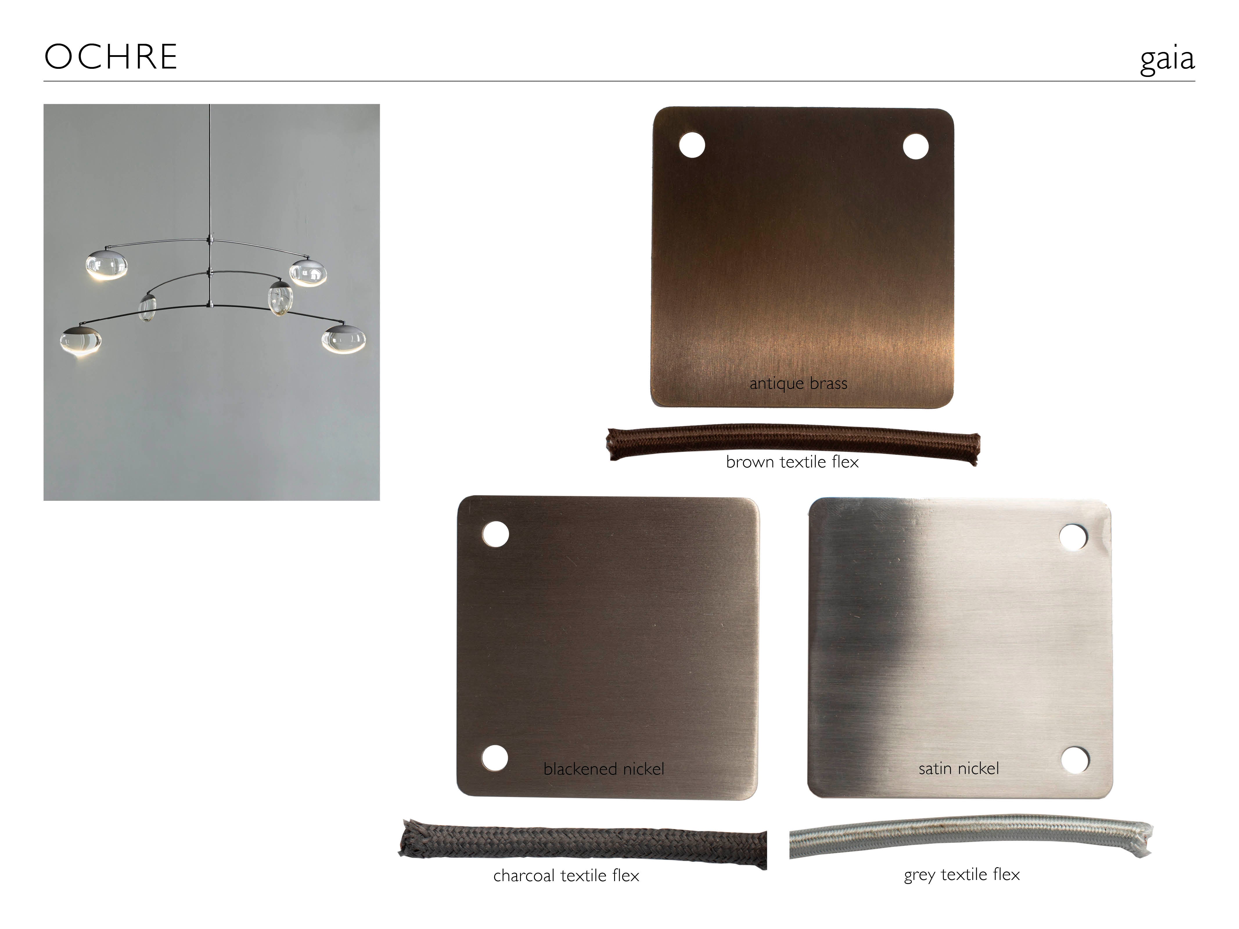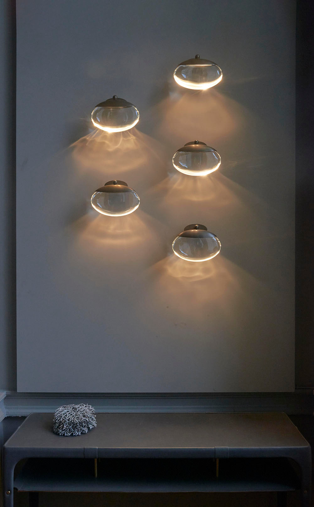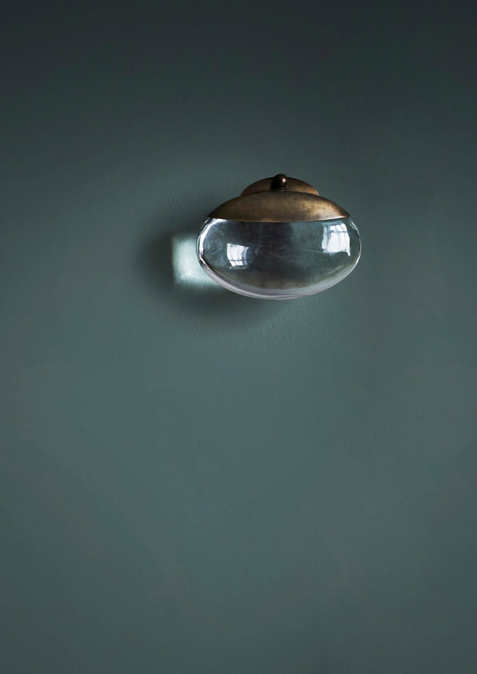 Gaia wall light - solid glass drop illuminated by LED, antique brass, blackened or satin nickel cap with matching