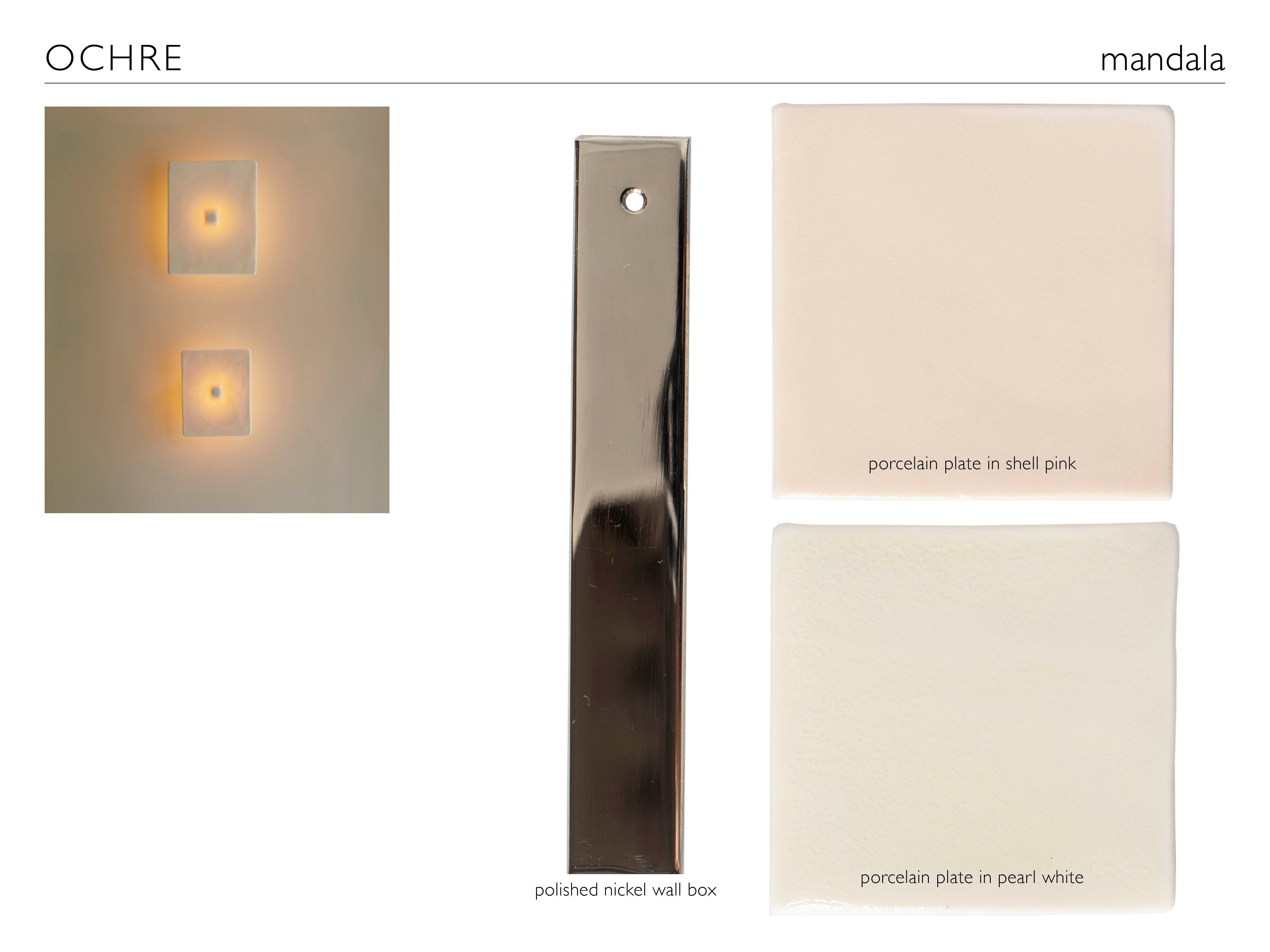 Mandala wall light - porcelain plate in shell pink or pearl white, illuminated by LED wall box with jointed arm and polished nickel finish