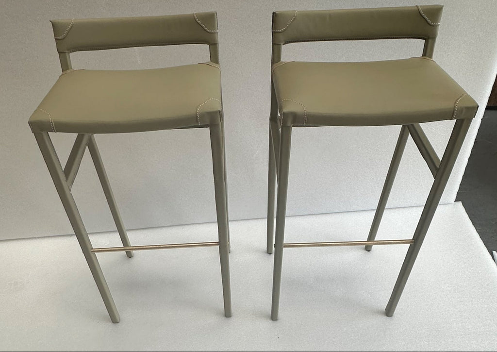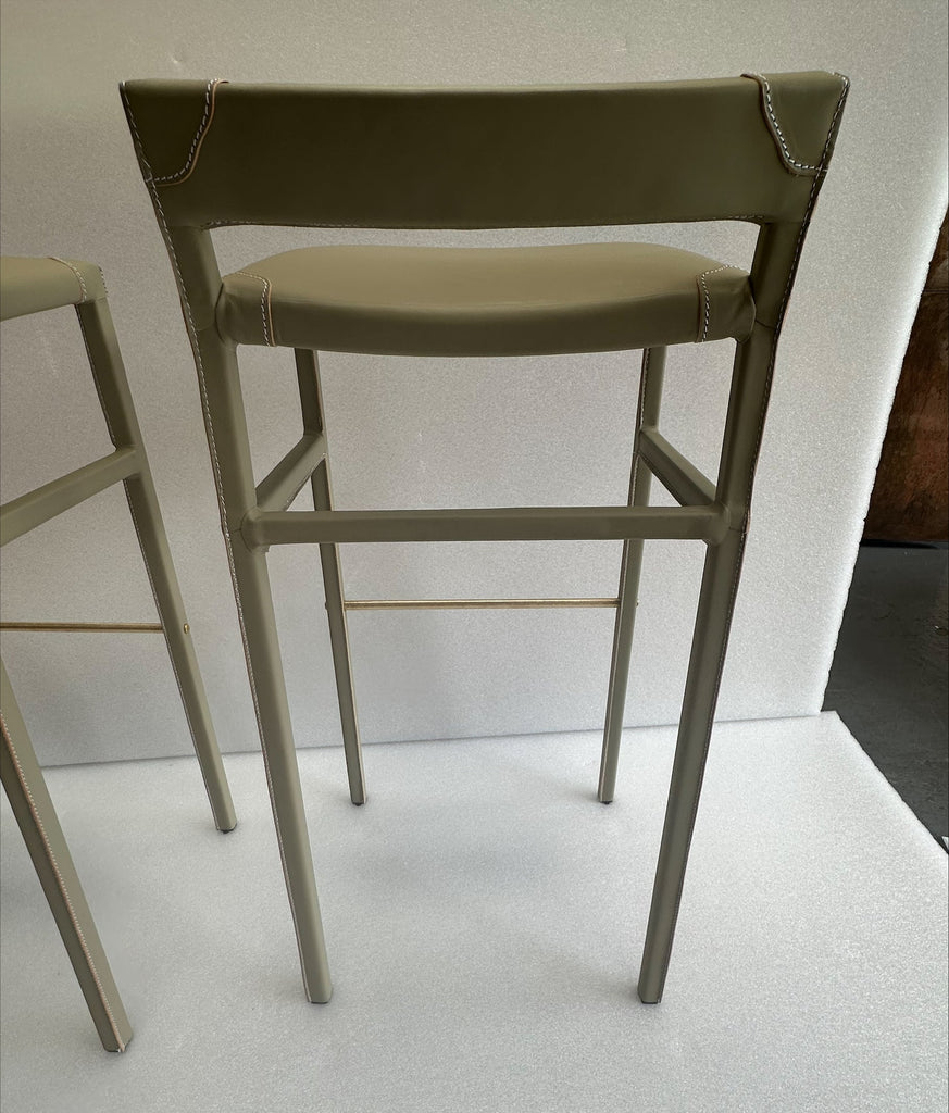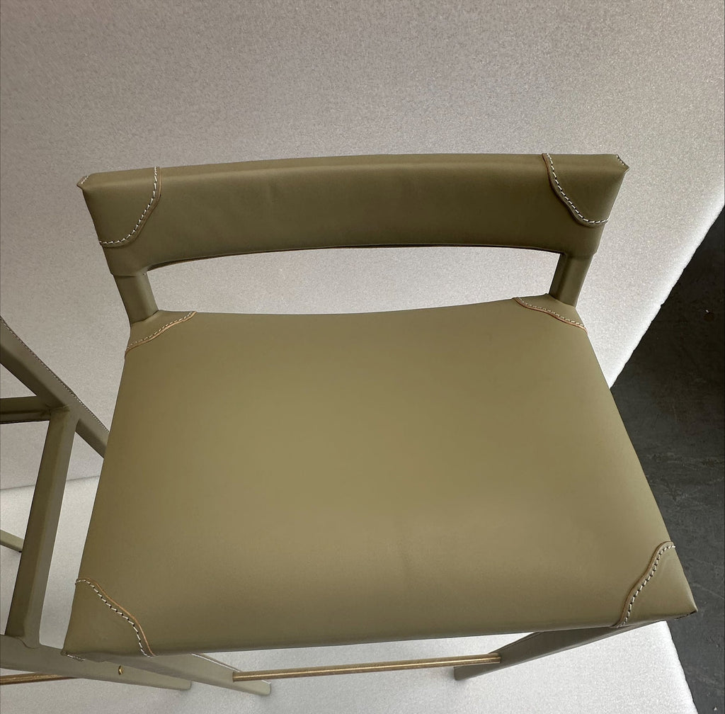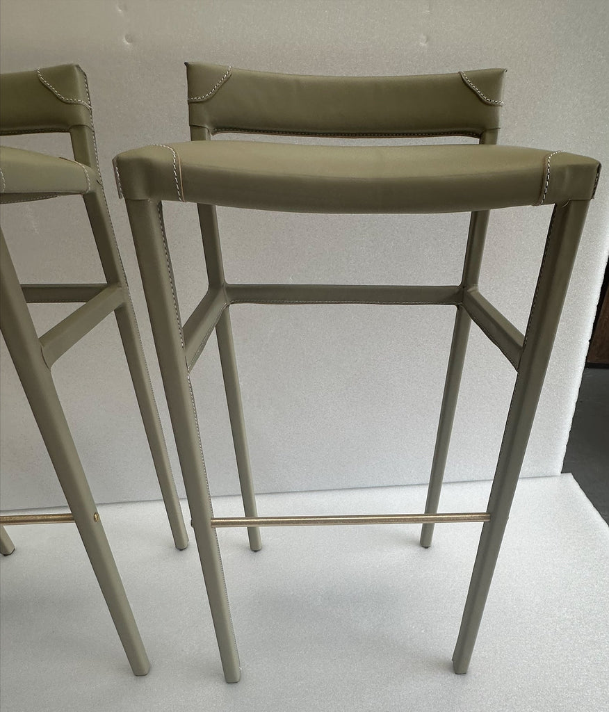 metal frame clad in the finest saddle leather with hand sewn pinched seams and scalloped corner details, brass footbar